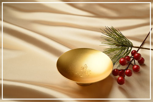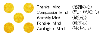 五つの円は、良いご縁を結ぶ為の心の持ち方、「人と人をつなぐ」心の有り方をシンボル化しています。人と出会う事で、共に生きる幸せに気づき新たな家族と未来を創造する事でしょう。それが地域社会の再生・発展となる様、ゴールドで表現しています。