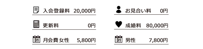 お見合い成立時にかかる「お見合い料」は1名につき5,000円です。出張や休日出勤の多い方など諸事情により活動時間が少ない方は、月会費を抑えながら効率的に活動出来ます。ヒアリング相談もリピートしながら当会の推薦も行っています。